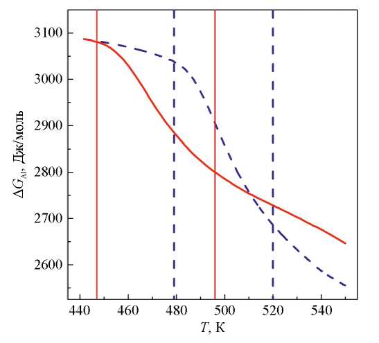 Рис. 7. Изменения термодинамической движущей силы формирования зародышей Al в аморфных сплавах Al87Ni8Gd5 (сплошные линии) и Al87Ni8Y5 (штриховые линии). Вертикальными соответствующими линиями показаны температуры Tons и Tend при скорости нагрева 0.083 K/с.