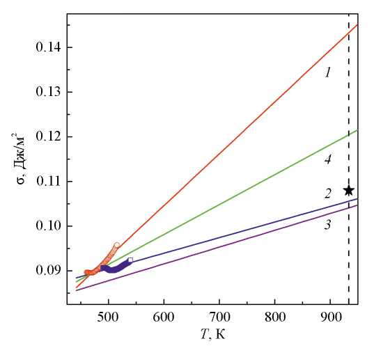 Рис. 9. Температурные зависимости удельной свободной энергии границы раздела кристаллической и аморфной (жидкой) фаз в сплавах на основе Al: 1 и 2 – Al87Ni8Gd5 и Al87Ni8Y5 соответственно, результаты настоящей работы, 3 – Al87Ni8Gd5, деформационно-индуцированная кристаллизация [38] с учетом давления, 4 – Al85Ce8Ni5Co2 [39], расчет по приближенной модели [32]. Звездочкой показано оцененное экспериментально значение для чистого Al [24].