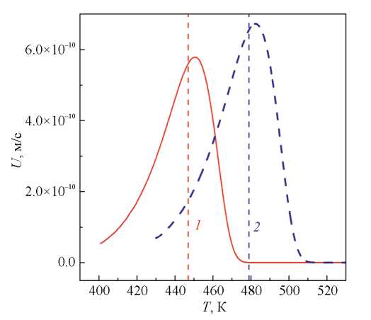 Рис. 10. Изменения скорости роста нанокристаллов Al в стеклах Al87Ni8Gd5 (сплошная линия) и Al87Ni8Y5 (штриховая линия) при нагреве со скоростью 0.083 K/с. Вертикальными линиями 1 и 2 обозначены температуры начала кристаллизации.