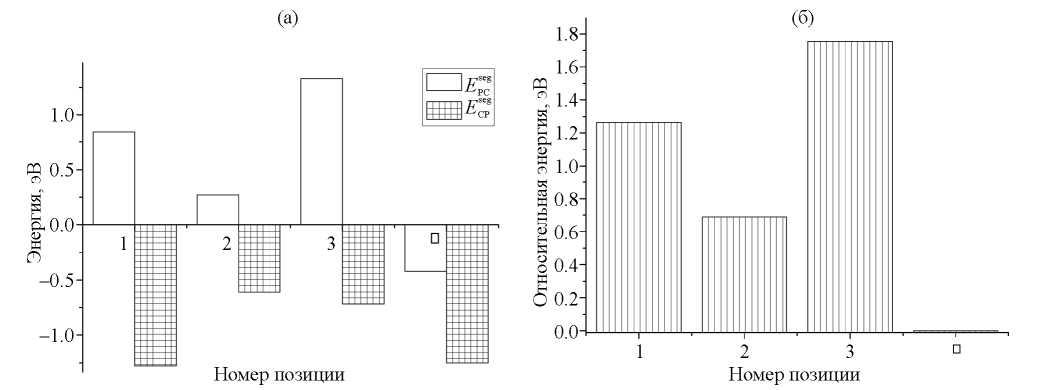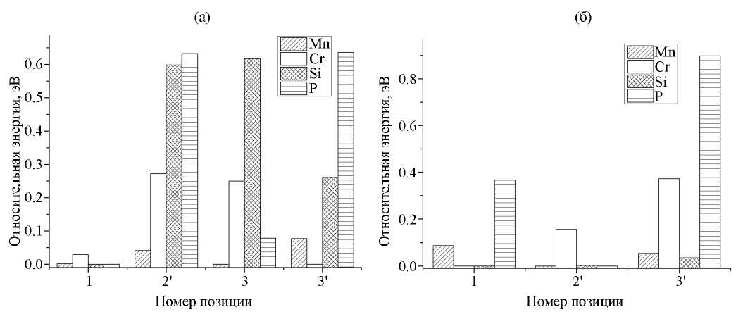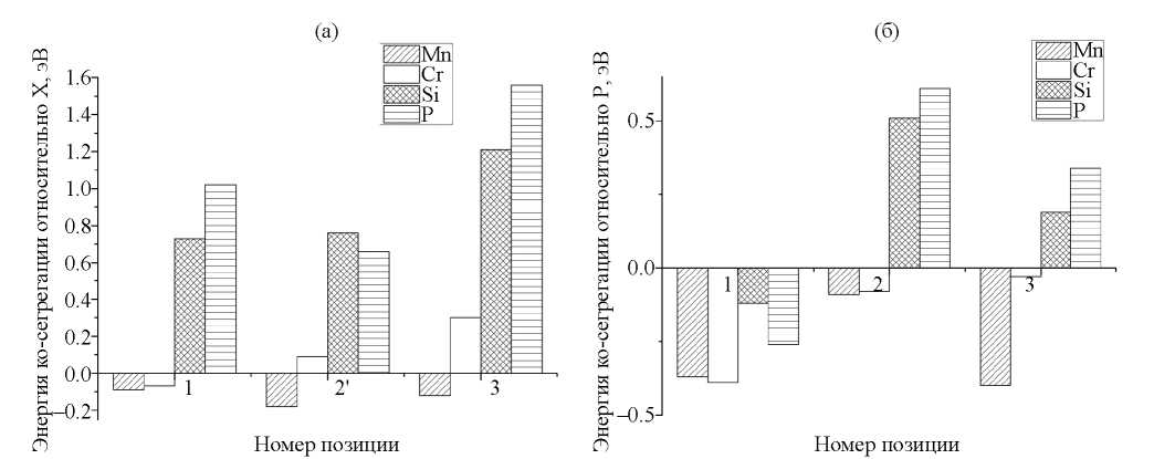 Из рисунка 6а видно, что при нахождении атома фосфора в позиции замещения, наименьшей энергией обладают конфигурации, в которых атомы Si, P, Mn находится в 1 позиции, а атом Cr – в позиции 3ʹ. Заметим, что в случае одиночного расположения этих примесей на ГЗ более предпочтительной (меньшая энергия сегрегации) являлась позиция 2 (рис. 2, табл. 1)). Причина изменения предпочтительной позиции растворения связана с взаимодействием между примесями. При расположении фосфора в узле внедрения (позиция 0) для всех примесей, кроме хрома, наименьшую энергию продолжает обеспечивать позиция 2 (рис. 6б). Для атома Cr более предпочтительной оказывается позиция 1, как показал наш расчет, благодаря понижению энергии на –0.11 эВ в данной позиции из-за взаимодействия с атомом P. Данные рисунка показывают, что сегрегированные атомы фосфора на границе зерна располагаются парами на близких расстояниях друг от друга в позициях 0–2 или 1–2.