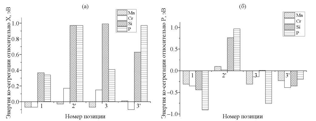 Рис. 11. Энергии ко-сегрегации атомов Р–X (Х=Mn, Cr, Si, P) в зависимости от номера позиции на границе зерна Σ3(111) (а) ; (б) . Атом фосфора находился во 2 позиции.