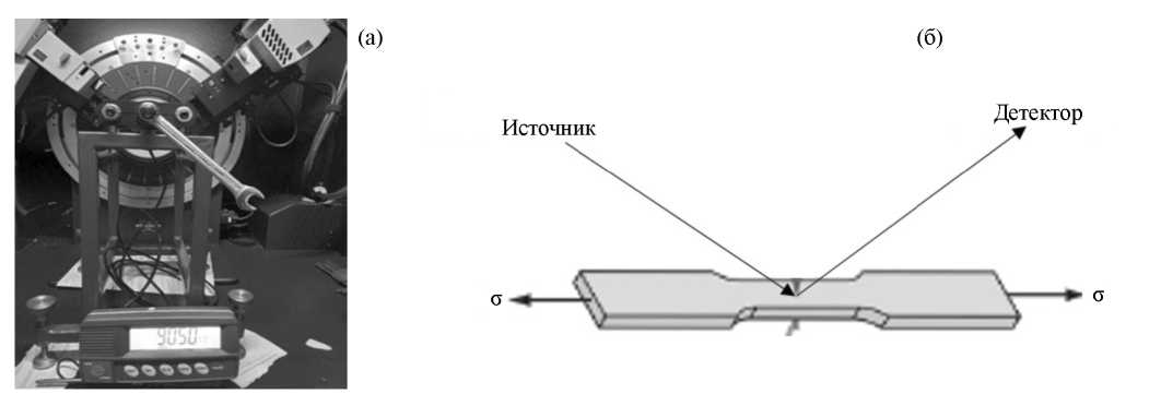 РСФА образцов в ходе растяжения и после снятия нагрузки осуществляли на дифрактометре Bruker D8 Advance в Kα-излучении меди. Вид приставки к дифрактометру для растяжения образца приведен на рис. 1а.