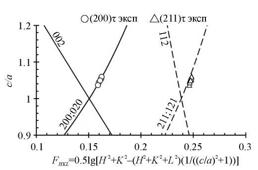 Для подтверждения адекватности полученных параметров и индексов интерференции HKL ОЦТ решетки τ-фазы положение линий 200τ, 211τ и рассчитанные значения сτ /аτ были нанесены на номограмму Бьерстрема для тетрагональной сингонии (рис. 5).