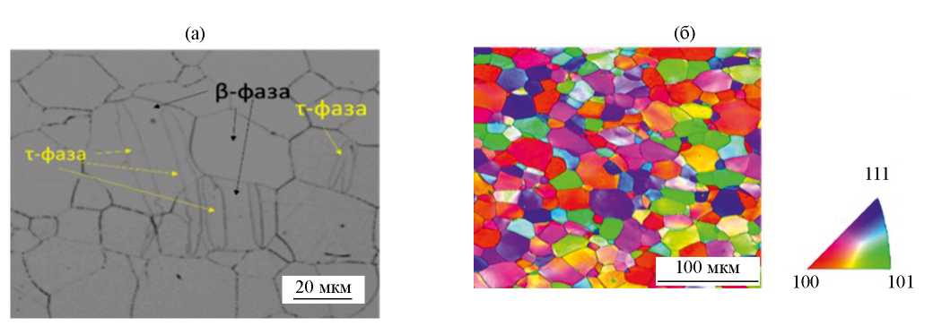Рис. 2. Дифрактограмма (а) и ориентационная микроскопия (б) закаленного сплава Ti–26Nb.