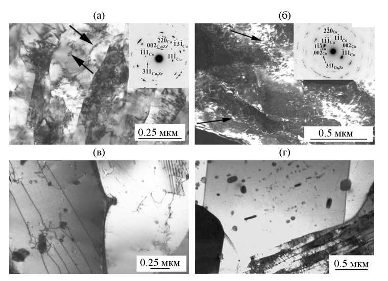 Последующие отжиги по-разному влияют на изменение СМК-структуры исследованных сплавов. Так, отжиг двойного и тройных СМК-сплавов, легированных Zr, при температурах 200–350°С не приводит к изменению структуры. Повышение температуры отжига до 350–400°С (для сплавов Cu–Cr–Zr) и до 400–450°С (для сплава Cu–Zr) вызывает дополнительный распад пересыщенного α-твердого раствора меди с выделением частиц Cu5Zr размерами 5–10 нм. На электронограммах (рис. 2а, б) присутствуют рефлексы фазы Cu5Zr. Гетерогенное выделение частиц на границах субзерен и на дислокациях показаны стрелками на рис. 2а, б. Вокруг гетерогенно выделившихся частиц Cu5Zr зачастую наблюдали деформационный контраст, указывающий на существование когерентной (или частично когерентной) связи между решетками [22–25]. Частицы Cu5Zr, выделяясь на дислокациях на границах и внутри зерен-субзерен, способствуют закреплению и уменьшению подвижности дислокаций в результате чего замедляется процесс образования центров рекристаллизации, требующий перестройки дислокационной структуры.