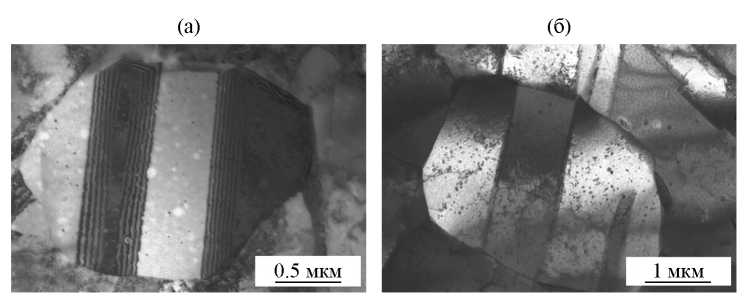Иную картину изменения СМК-структуры при последующих отжигах наблюдали в двойном сплаве, легированном Cr. В сплаве Cu–0.22%Cr рекристаллизация СМК-структуры начинается при температурах 300–350°С и уже нагрев до 400°С приводит к образованию на фоне деформированной структуры отдельных новых зерен размерами 2–3 мкм, содержащих большое количество двойников отжига (рис. 4а).
