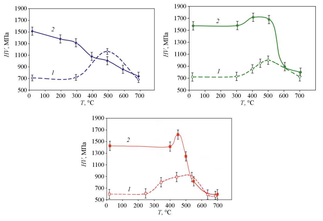 Увеличение температуры отжига до 550 и 600°С приводит к снижению микротвердости двойного и тройных сплавов, легированных Zr (рис. 5, кривые 1, 2), что обусловлено развитием процесса рекристаллизации (рис. 2в, г). Тем не менее повышение температуры отжига до 700°С не приводит к существенному росту зерна, как обсуждалось выше.