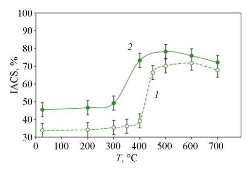 Высокоскоростная деформация методом ДКУП повышает электропроводность сплава до 45% IACS по сравнению с закаленным состоянием (ср. кривые 1 и 2 на рис. 7). Это связано, как обсуждалось выше, с частичным распадом пересыщенного α-твердого раствора меди уже в процессе ДКУП, что подтверждается структурными наблюдениями, а также результатами измерения микротвердости.