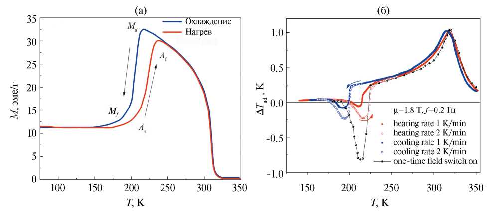 Рис. 1. (a) Температурная зависимость намагниченности Ni47Mn40Sn13 в магнитном поле с индукцией 20 мTл (на графике заменить FCC и FCH на охлаждение и нагрев; (б) температурная зависимость DТад в циклическом магнитном поле с индукцией 1.8 Тл в режимах нагрева и охлаждения при различных скоростях изменения температуры образца. Сплошные кружки — значения DТад при разовом включении магнитного поля 1.8 Тл в режиме нагрева.