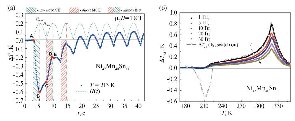 Таким образом, проведены исследования частотной и температурной зависимости адиабатического изменения температуры в сплаве Гейслера Ni47Mn40Sn13 как в циклических магнитных полях, так и при разовых включениях магнитного поля.