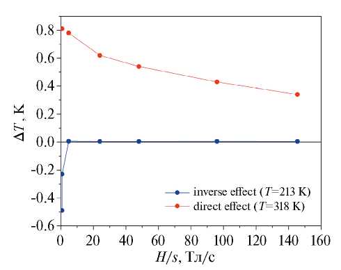 На рис. 3 приведены зависимости максимума прямого и обратного эффекта от скорости развертки магнитного поля. Начальные точки для обоих эффектов соответствуют разовым включениям магнитного поля с разверткой 0.72 Тл/с. Последующие точки соответствуют циклическому воздействию магнитного поля с разверткой от 1 Тл/с до 145 Тл/с. Известно, что происхождение гистерезиса для материалов, претерпевающих фазовый переход первого рода, может быть связано как с внутренними свойствами, так и внешними факторами, которые могут влиять на поведение гистерезиса, обуславливая процесс зарождения и роста основной фазы. К внутренним свойствам можно отнести магнитоструктурную связь, движение доменных стенок, магнитную анизотропию, электронную структуру, спиновые флуктуации и т. д. К внешним факторам относятся микроструктура, в том числе дефекты, размер зерна, напряжение на границе раздела фаз индуцированное внешним полем.