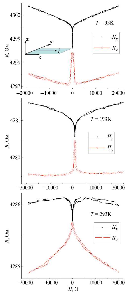 В малых полях наблюдается резкий минимум продольного магнитосопротивления. При T = 93 и 193 K, соответствующих ферромагнитному состоянию, реализация данного минимума продольного и соответствующего максимума поперечного магнитосопротивления может быть связана с эффектом анизотропного магнитосопротивления ферромагнитной пленки.