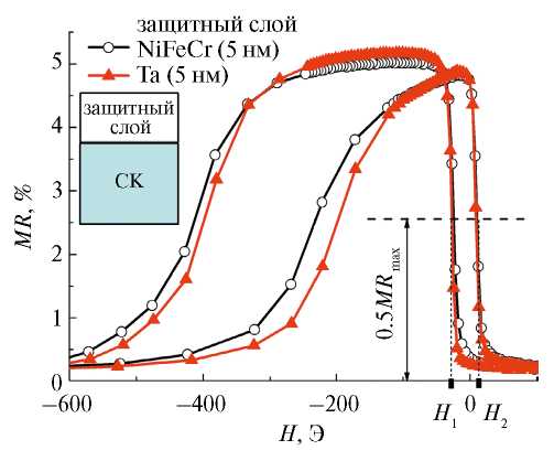 Перемагничивание спиновых клапанов. На рис. 3 показаны полевые зависимости магнитосопротивления спиновых клапанов, с разным составом верхнего защитного слоя: β-Ta или сплав NiFeCr. Отличия в форме магниторезистивных кривых и величине максимального магнитосопротивления (MRmax) пренебрежимо малы.