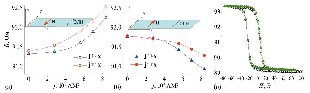На рис. 5а показаны результаты измерений для СК с верхним слоем NiFeCr, проведенных при приложении постоянного внешнего магнитного поля H ≈ H1. Поле соответствует ветви петли гистерезиса, на которой магнитосопротивление возрастает (рис. 3) и противонаправлено ООА. Видно, что с увеличением плотности тока электросопротивление возрастает. Тенденция к возрастанию не зависит от направления тока, тем не менее при j↑↑x электросопротивление и, соответственно, магнитосопротивление СК больше, чем при j↑↓x. Затем начальное магнитное состояние спинового клапана изменили путем приложения постоянного магнитного поля H ≈ H2, сонаправленного ООА и соответствующего ветви петли гистерезиса, на которой магнитосопротивление СК уменьшается (рис. 3). Магнитосопротивление СК уменьшалось после каждого прохождения тока (рис. 5б), независимо от его направления, однако и в этом случае при j↑↑x магнитосопротивление СК больше, чем при j↑↓x.