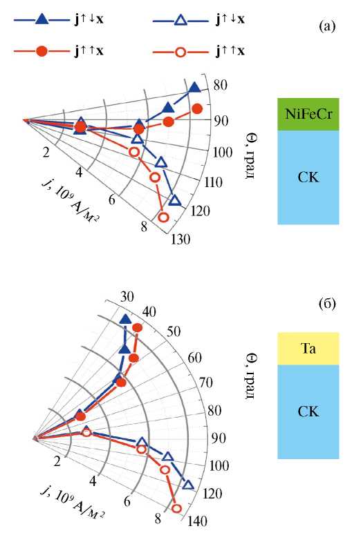 На рис. 6 показаны зависимости угла Θ от плотности и направления тока для спиновых клапанов с разным составом немагнитного металла, соседствующего со свободным слоем.