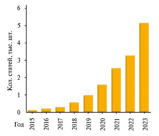 Концепция больших данных, развитие искусственного интеллекта и алгоритмов машинного обучения (МО) значительно изменили современную науку: быстро набирает обороты четвертая парадигма науки, заключающаяся в том, что исследования проводятся с использованием поиска закономерностей в огромных массивах данных [1]. Перспективы, открывающиеся с применением МО в различных научных областях, сильно отличаются и зависят от характера исследований. Очень большим потенциалом обладает сочетание МО с химией и наукой о материалах. В последние несколько лет наблюдается экспоненциальный рост количества научных публикаций, связанных с использованием МО в материаловедении (рис. 1). Публикационная динамика наглядно демонстрирует высокий спрос на такие исследования. Кроме того, большие перспективы данного подхода привели к появлению таких программ, как “Materials Genome Initiative”, “Novel Materials Discovery”, “Materials design at the eXascale”, и многих других, призванных направить, поддержать и систематизировать подобные исследования.