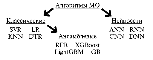 К настоящему моменту разработаны десятки различных алгоритмов для решения задачи регрессии, многие из которых используются при прогнозе свойств материалов, в том числе магнитных. Существует несколько подходов к их классификации. Один из наиболее простых подходов предполагает деление всего на две группы: классические алгоритмы и алгоритмы глубокого обучения. Классическими алгоритмами считаются те, которые не задействуют в своей работе искусственные нейронные сети (Artificial Neural Networks). Алгоритмами глубокого обучения, напротив, называют любые алгоритмы, основанные на искусственных нейронных сетях. В свою очередь, в группе классических алгоритмов можно выделить подгруппу ансамблевых алгоритмов (рис. 3).