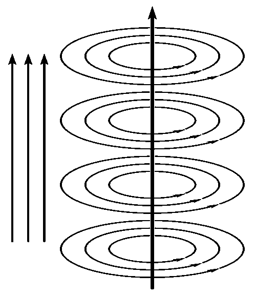 Рис. 3. Схематическое изображение вихря в сверхпроводнике II рода. Вихрь параллелен внешнему магнитному полю. Силовые линии поля снаружи проводника и в центре вихря обозначены прямыми стрелками, а вихревые токи — замкнутыми круговыми стрелками.