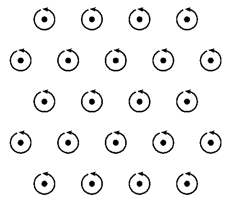 Рис. 4. Треугольная решетка вихрей, если смотреть в направлении магнитного поля. Каждый кружок со стрелкой условно изображает вихревой ток, а точка в середине кружка — направленную к нам силовую линию магнитного поля. Каждые три соседних вихря образуют правильный треугольник.