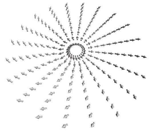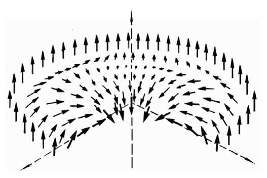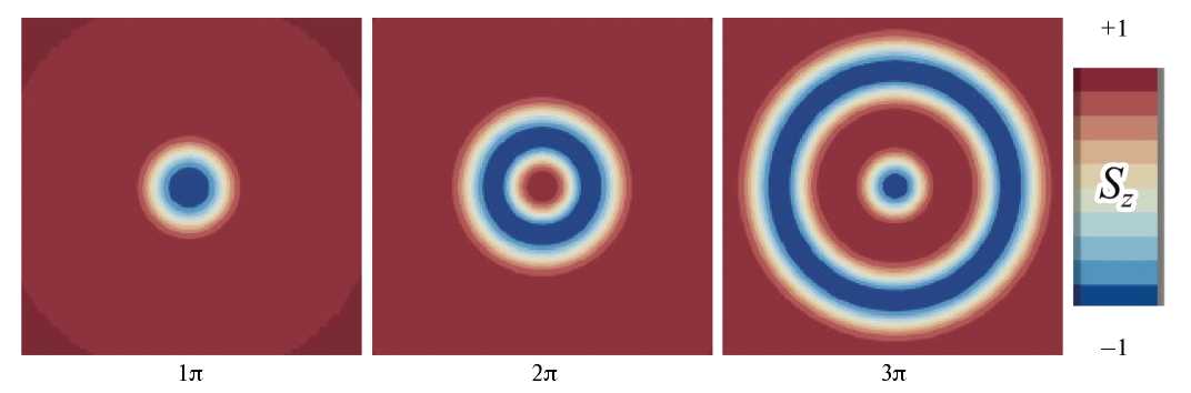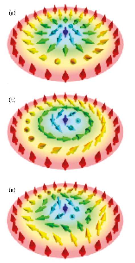 В приведенных выше примерах вихревые решения описывали циркулярное движение жидкости или Бозе-газа, т.е. реальное вращательное движение частиц или смещения атомов в дислокациях. Однако очень сходные, но статические состояния существуют и в магнетиках. Ограничимся классическим описанием ферромагнитно упорядоченных магнетиков при низких температурах [25]. Макроскопическая теория ферромагнетика основана на возможности его описания в терминах классического вектора намагниченности M, равного магнитному моменту единицы объема кристалла и меняющегося в пространстве и времени с сохранением своей величины ( ). Гамильтониан, определяющий магнитные структуры в ферромагнетиках, учитывает довольно много взаимодействий (таких как обменное, магнитодипольное, взаимодействие Дзялошинского–Мория, взаимодействие с внешним полем, магнитостатическую энергию и т. д.), которые образуют определенную иерархию. Однако наибольший вклад вносит обменное взаимодействие энергии Гейзенберга. Кроме того, из теоремы Хоббарта–Деррика [26, 27] следует, что локализованные двумерные магнитные структуры в соизмеримых ферромагнетиках с конечной энергией существуют только в обменном приближении.
