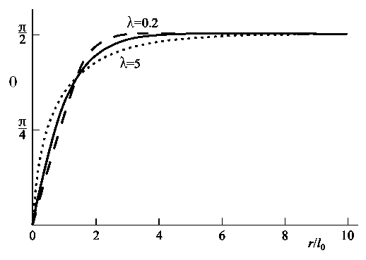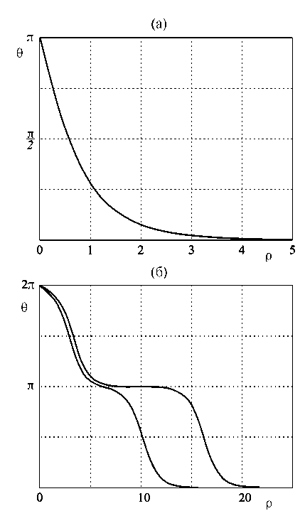 Простейшие типы вихрей этой системы были подробно описаны ранее [9]. Пусть выполнены условия , , , тогда имеем сильную кристаллографическую анизотропию, которая стремится “положить” вектор намагниченности среды в плоскость . В плоскости более слабая остаточная анизотропия выделяет “легкое” направление — ось . Отсюда следует, что угол близок к значению . В итоге наша модель в безразмерных переменных сводится к популярному стационарному уравнению sin-Gordon: