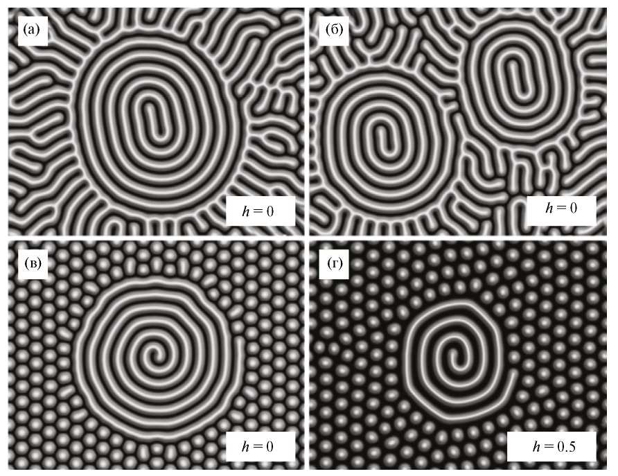 Было показано, что вихри и их решетки в этой системе с топологическим зарядом образуются пересечением доменных границ [28–30] или, как предсказано в [28], при разрыве доменных границ, а также на их концах. Отметим, что наибольший вклад в энергию ферромагнетика вносит энергия обменного взаимодействия Гейзенберга, которая и порождает вихревые структуры. Поэтому один из подходов к исследованию новых магнитных состояний заключается в минимизации обменной энергии Гейзенберга: