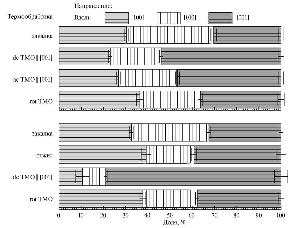 Приведенные в табл. 2 распределения относительных объемных долей намагниченности по направлениям <100> в кристалле изображены в виде диаграмм на рис. 3. В образцах с ГО осей после термической обработки под действием магнитного поля или растягивающей нагрузки, которые были приложены параллельно ОЛН [001], наблюдаются наибольшие значения доли , от 63 до 67% при погрешности 2–3%. Доля намагниченности по двум другим осям [100] и [010] составляет от 33 до 37% или 16–19% по каждой из них.