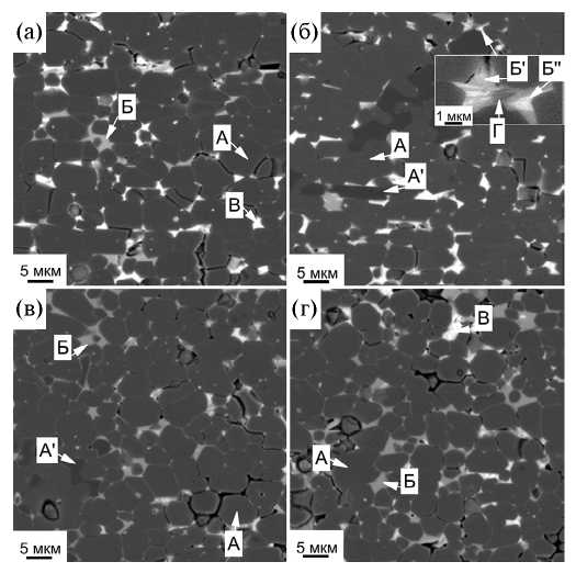 В образце после закалки от Тсп (рис. 6а) помимо зерен основной фазы (А) с химическим составом, близким к составу основной магнитной фазы 2:14:1, присутствует светло-серая фаза (Б), которая локализуется по границам зерен и в тройных стыках, и белая фаза с наибольшим содержанием редкоземельных элементов и кислорода (В), определяемая как (Nd, Pr)Ox. Галлий, медь и алюминий преимущественно локализованы в фазе Б.