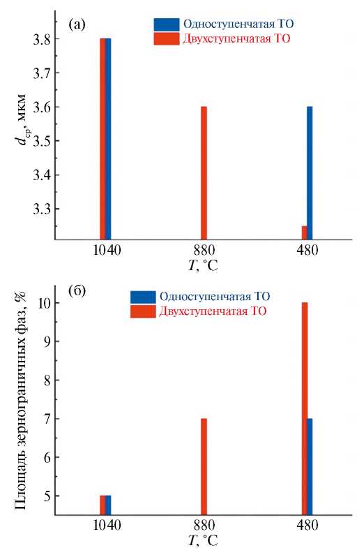 Рис. 7. Диаграммы значений среднего размера зерна (а) и площади зернограничных фаз (б) магнитов при ТО по одноступенчатой и двухступенчатой схемам.