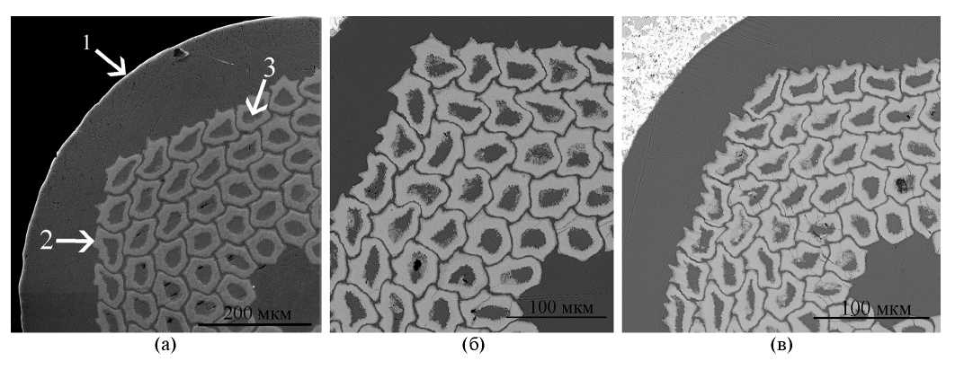 Рис. 1. СЭМ-изображения (в режиме Z-контраст) фрагментов шлифов поперечных сечений образцов 1 (∅ 1.0 мм) (а), 2 (∅ 0.7 мм) (б) и 3 (∅ 0.5 мм) (в) после РТО 370°С, 100 ч + 665°С, 40 ч. На рис. 1а стрелками отмечены: 1 — стабилизирующая медь; 2 — субэлемент; 3 — источник олова.