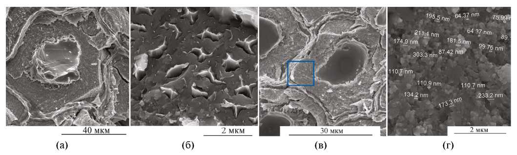Сверхпроводящий слой этого образца значительно более однородный, форма большинства зерен равноосная, нет участков с аномально крупными зернами, разброс зерен по размерам незначительный (рис. 5г–е).
