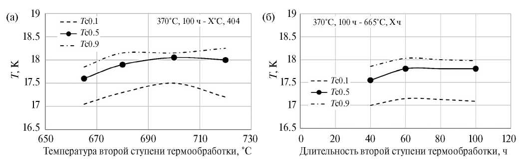 Рис. 3. Критическая температура (Тc0.1, Тc0.5 и Тc0.9) образца 1 (Ø 1.0 мм) в зависимости от температуры (а) и длительности (б) второй ступени термообработки.