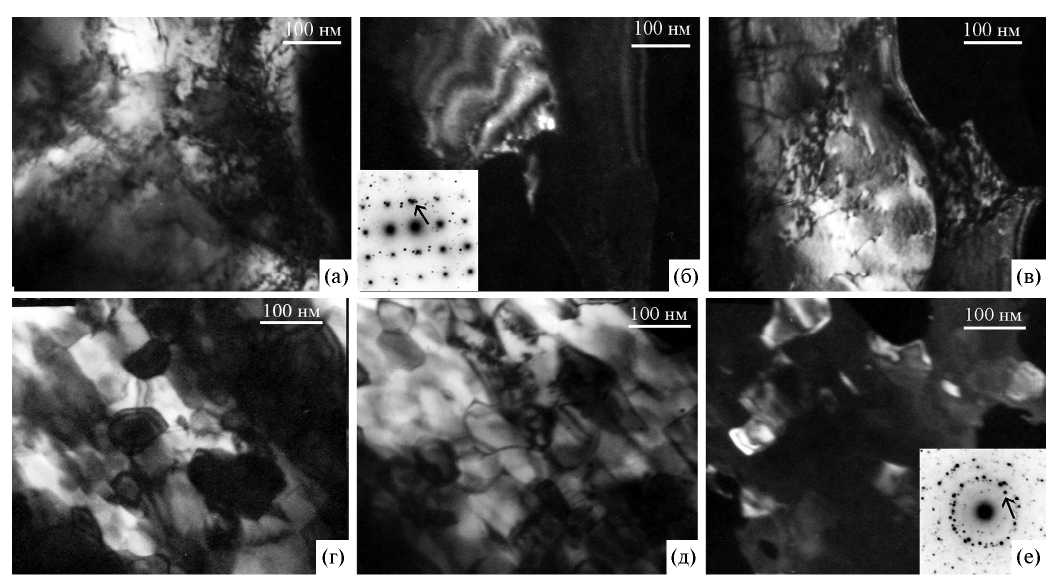 Рис. 5. Структура образца 2 (∅ 0.7 мм): а–в — остаточный ниобий — светлое поле (а), темные поля в рефлексах (͞1͞10)Nb, (210) Nb3Sn и (200) Nb3Sn, указанных стрелкой на электронограмме (б, в), ось зоны [001]Nb; г–е — сверхпроводящий слой — светлые поля (г, д), темное поле (е) в рефлексе (200)Nb3Sn (указан стрелкой на электронограмме).