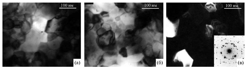 Рис. 6. Структура сверхпроводящего слоя образца 3 (∅ 0.5 мм): а, б — светлые поля; в — темное поле в рефлексах (211)Nb3Sn и (210)Nb3Sn и электронограмма.