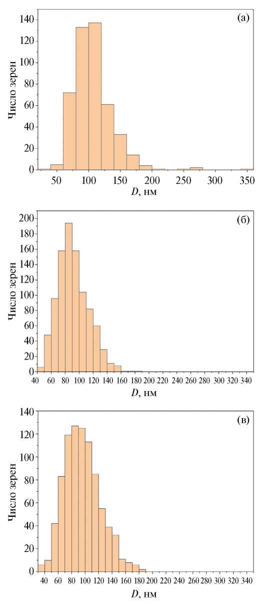 Рис. 7. Гистограммы распределения зерен Nb3Sn по размерам в образцах разного диаметра: а — образец 1 (∅ 1.0 мм); б — образец 2 (∅ 0.7 мм); в — образец 3 (∅ 0.5 мм). ПЭМ.