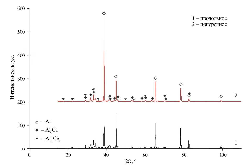 Рентгенограммы сплава Al–6Ca–3Ce после РКУП, полученные в продольном и поперечном сечении образца, представлены на рис. 5. В структуре сплава выявлены 3 фазы: Al, Al4Ca и Al11Ce3. Их объемная доля составила 79 %; 19% и 2% соответственно, независимо от ориентации образца. Al — это практически чистый алюминий — основная фаза сплава. Al4Ca и Al11Ce3 — это интерметаллидные фазы эвтектического происхождения. Согласно данным МРСА, приведенным выше, в фазе Al4Ca растворен церий, и она описывается формулой Al4(Ca,Ce), а в фазе Al11Ce3 растворен кальций, и она описывается формулой Al11(Ce,Ca)3. Кроме того, на рентгенограммах наблюдается небольшое перераспределение интенсивностей дифракционных линий между продольным и поперечным сечениями образца. После РКУП период решетки (Al) как в продольном, так и в поперечном направлении составил 4.051 Å, что соответствует чистому алюминию и подтверждает отсутствие растворимости кальция и церия в твердом растворе. Плотность дислокаций в сплаве после РКУП, рассчитанная по результатам рентгеновской дифрактометрии в соответствии с уравнением (1), составляет от 108 до 109 см−2.