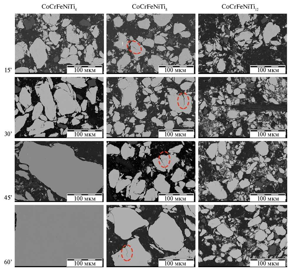Рис. 1. СЭМ-изображения микроструктуры порошков CoCrFeNiTi4, CoCrFeNiTi8 и CoCrFeNiTi12 после 15, 30, 45, 60 мин МЛ. Трещины в частицах обведены красной штриховой линией.