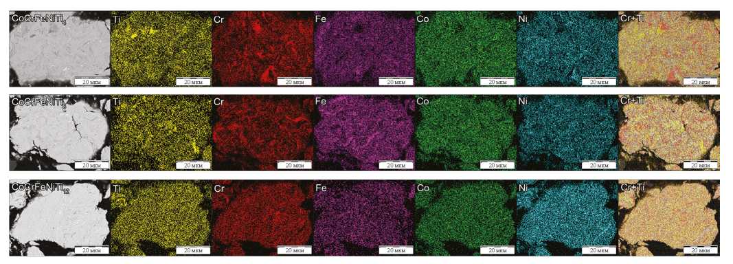 Под действием МЛ одновременно с образованием агломератов происходил обратный процесс их механического разрушения, более заметный на крупных частицах. Данные, полученные для композиций CoCrFeNiTi4 и CoCrFeNiTi8, соотносятся с результатами Demétrio [40], согласно которым в ходе продолжительного МЛ размер частиц металлических порошков сначала увеличивается в результате агломерации, а затем уменьшается в результате их разрушения. В нашем случае продолжительность МЛ, после которой начинается уменьшение размера частиц в смесях CoCrFeNiTi4 и CoCrFeNiTi8, вероятно, не была достигнута. C увеличением продолжительности МЛ повышалась однородность распределения элементов по объему гранул.