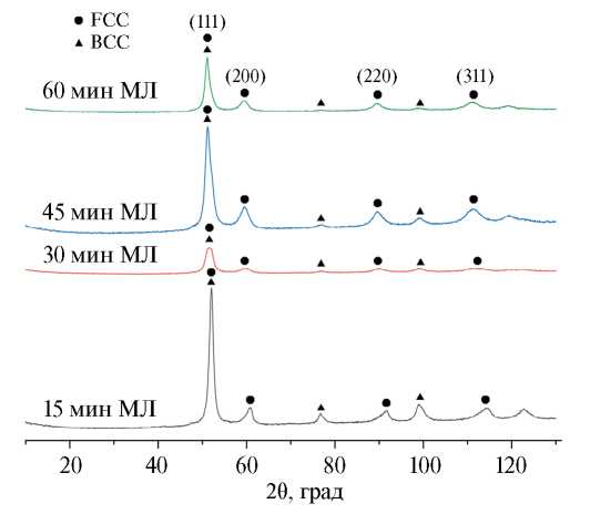 При увеличении продолжительности МЛ массовая доля ОЦК-фазы снижается практически в три раза — с 47.1% после 15 мин МЛ до 15.8% после 60 мин МЛ. За то же время массовая доля ГЦК-фазы возрастает с 52.9% до 84.2%. Одновременно периоды решетки данной фазы увеличиваются с 0.3567 нм до 0.3614 нм, вероятно, за счет формирования твердого раствора в результате МЛ.