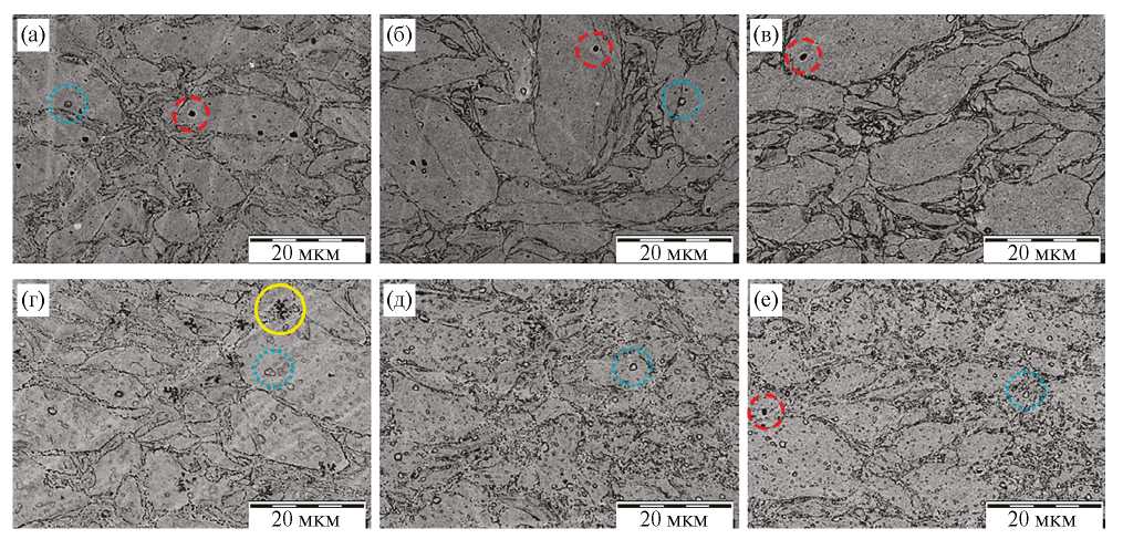 Рис. 5. СЭМ-изображения микроструктур компактов CoCrFeNiTi4 (а), CoCrFeNiTi8 (б), CoCrFeNiTi12 (в), CoCrFeNiTi4(TiH2) (г), CoCrFeNiTi8(TiH2) (д), CoCrFeNiTi12(TiH2) (е). Одиночные темные округлые включения, сферические включения с темными границами и скопления мелких темных включений обведены красной штриховой, бирюзовой пунктирной и желтой сплошной линиями, соответственно.