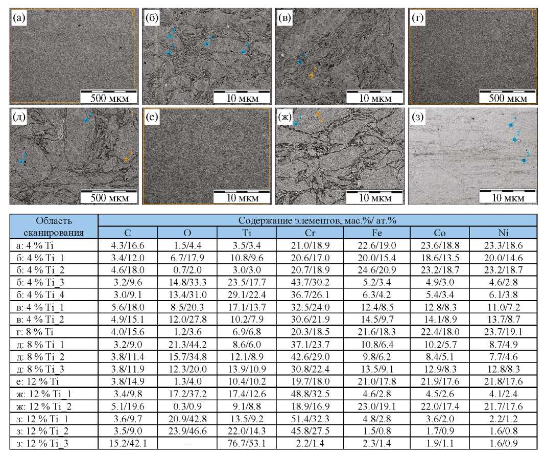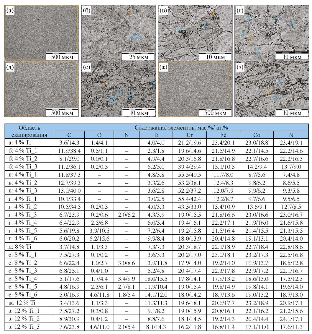 В образцах CoCrFeNiTi4 весовая доля ГЦК-фазы составила 98.6%, а оставшиеся 1.4% были представлены фазой Ti(O,N). При увеличении содержания Ti до 8% и 12% массовая доля ГЦК-фазы снизилась до 94.1% и 74.1% соответственно. Это произошло за счет образования тетрагональной фазы на основе раствора замещения, состоящего из атомов Fe, Co, Cr и Ni (σ-фазы), массовая доля которой в образцах CoCrFeNiTi8 и CoCrFeNiTi12 составила 2.4% и 23.8% соответственно. Массовая доля фазы Ti(O,N) в этих образцах также возросла, не превышая при этом 3.5 % (табл. 3). Образцы, изготовленные с применением TiH2, состояли преимущественно из ГЦК-фазы. В компактах CoCrFeNiTi4(TiH2) массовая доля этой фазы составила 99.6%, а оставшиеся 0.4% были представлены фазой Ti(O,N). В образцах CoCrFeNiTi8(TiH2) содержание фазы Ti(O,N) повысилось до 3.2%. В образцах CoCrFeNiTi12(TiH2) содержание фазы Ti(O,N) увеличилось до 4.8%, и, кроме того, дополнительно образовалась σ-фаза.