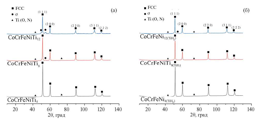 Рис. 8. Рентгенограммы компактов Co–Cr–Fe–Ni–Ti, полученных методом ГП. Исходная порошковая смесь содержала Ti в виде металлического порошка (а) или в виде TiH2 (б).