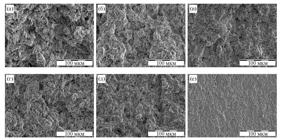 Рис. 9. Микроструктура изломов компактов CoCrFeNiTi4 (а, г), CoCrFeNiTi8 (б, д) и CoCrFeNiTi12 (в, е) после испытаний на трехточечный изгиб. Исходная порошковая смесь содержала Ti в виде металлического порошка (а–в) или в виде TiH2 (б–е).