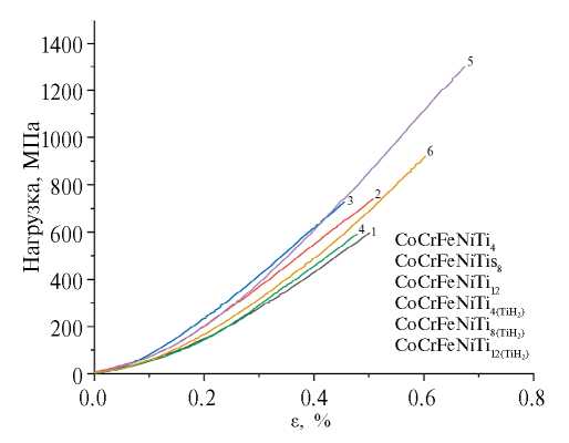 По результатам испытаний на растяжение наилучшие свойства имеют образцы CoCrFeNiTi8(TiH2). Среднее значение предела прочности на растяжение для них составило 690 МПа (табл. 4). Все исследованные образцы сломались в упругой области, что характеризует их как непластичные (рис. 10).