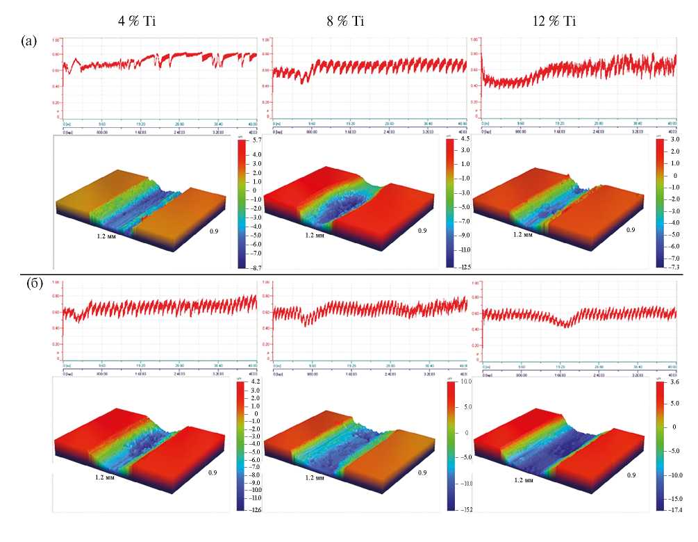 Рис. 11. Кривые силы трения и топография дорожек износа для образцов, содержащих 4, 8, 12%Ti. Исходная порошковая смесь содержала Ti в виде металлического порошка (а) или в виде TiH2 (б).