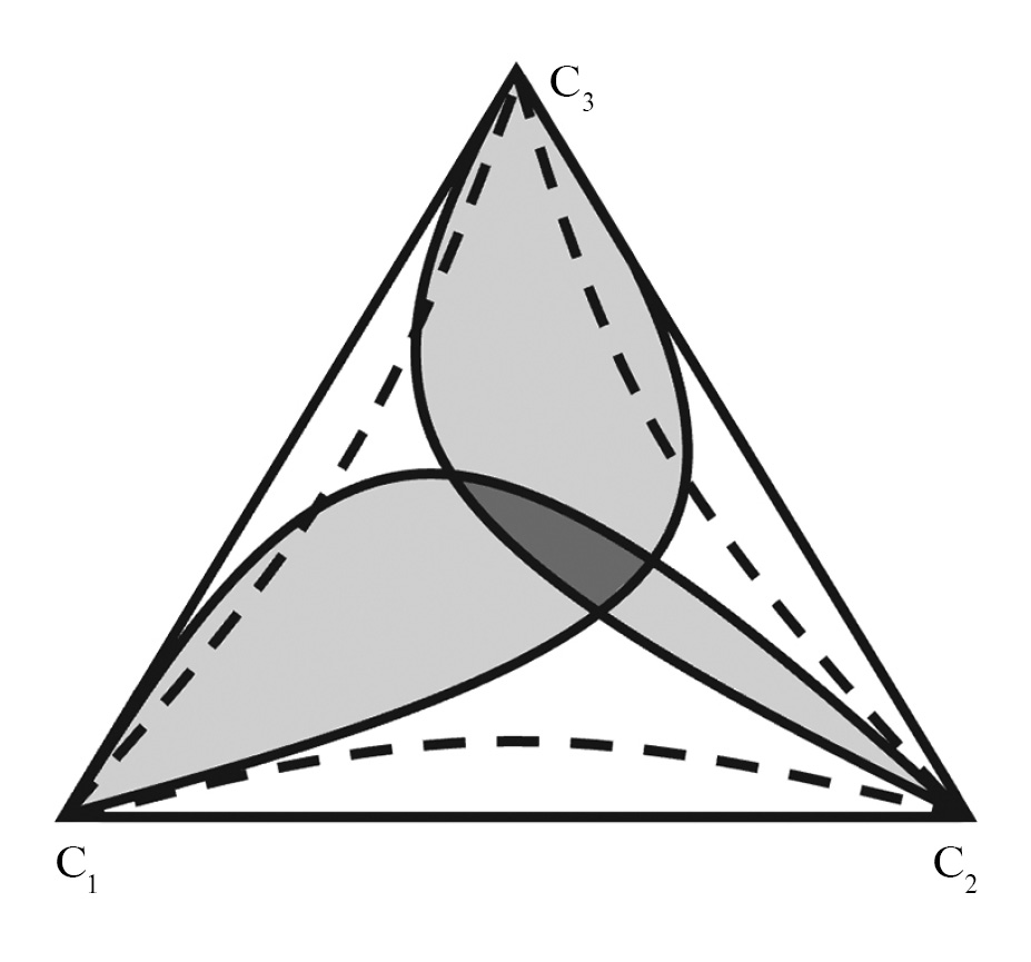 Картина спинодального распада в трехкомпонентном сплаве является в общем случае довольно сложной, поскольку определяется выпуклостью функции свободной энергии по спектру возможных направлений на диаграмме состояний. В общем виде спинодальный распад трехкомпонентного сплава рассматривался в работах [37, 38]. На рис. 1 схематически представлен частный случай диаграммы состояния тройного сплава, когда имеется стимул распада по всем компонентам (то есть энергия взаимодействия атомов сорта a и b, vab < 0). Если фигуративная точка сплава оказывается в области перекрытия спинодальных областей (темные участки на диаграмме), можно ожидать реализации спинодальной неустойчивости по различным парам компонент. В этом случае возможна ситуация, когда выделения одного компонента стимулируют зарождение или препятствуют росту выделений другого компонента, приводя к повышению дисперсности сплава [7].
