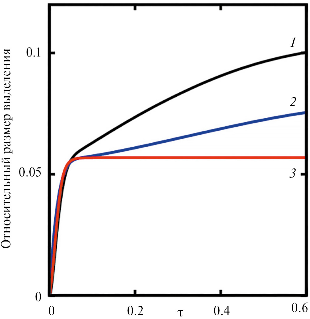 На рис. 3 приведено изменение со временем максимального размера выделения компонента A в случае формирования сплошной оболочки при различных соотношениях коэффициентов диффузии (D A (M, shell), D B (M, A) – собственные коэффициенты диффузии компонента A в матрице и оболочке, компонента B в матрице и выделениях компонента A соответственно, которые в работе [41] были приняты равными соответствующим коэффициентам изотопной диффузии). Можно видеть, что распад развивается наиболее быстро, если диффузия компонента B полностью заморожена (кривая 1). Перераспределение компонента B приводит к формированию оболочки, затормаживая распад по компоненту A (ср. кривые 1 и 2). При этом наиболее эффективная стабилизация выделений реализуется, если подвижность компонента A понижается в области сформированной оболочки (кривая 3), т. е. выделения A фактически оказываются изолированы от матрицы.