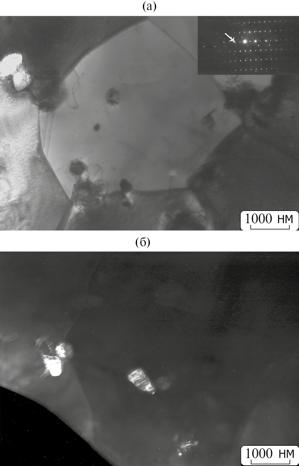 Рис. 2. Микроструктура исходного образца (ПЭМ): а — светлопольное изображение с микроэлектронограммой; б — темнопольное изображение в рефлексе β-фазы.