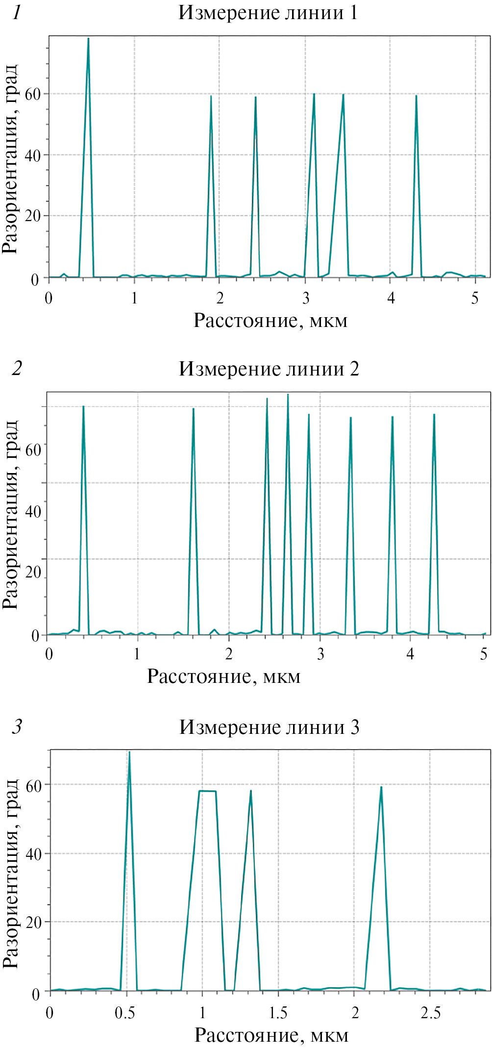 На гистограмме распределения углов разориентировок границ зерен выделяется пик в области углов разориентации 60°, наличие которого может служить доказательством образования двойников (рис. 3в). Для уточнения значений углов разориентировок были сняты профили разориентировок по линиям сканирования 1, 2, 3, показанным на рис 3а. График построен при анализе изменения ориентировки при переходе от точки к точке. Каждая линия пересекает несколько структурных фрагментов (двойников) разной протяженности и толщины, расположенных внутри зерен, имеющих различную кристаллографическую ориентацию. Анализируя профили разориентировок, установлено, что внутри каждого зерна соседние фрагменты разориентированы на углы 60 ± 5°, а углы разориентировок межзеренных границ отличаются от этих значений (рис. 4).