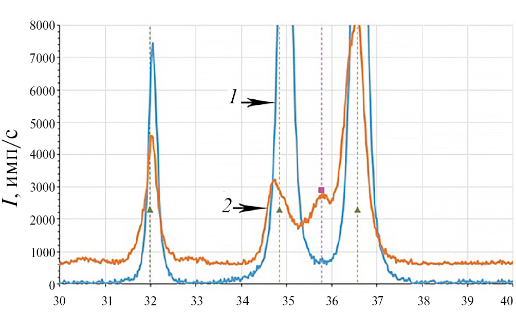 Рис. 7. Участок дифрактограммы исходного (1) и обработанного лазером (2) образцов. Штрихами показаны табличные значения углов отражения от плоскостей α(α`) — ▲, и ω-фаз — ■.